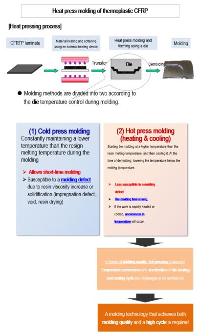 ・To obtain an automotive part using thermoplastic CFRP, the company is working to develop a heat press molding technology that enables cost reduction at a higher cycle than the conventional thermosetting CFRP autoclave molding. In this effort, the company has developed a technology for accelerating the die heating/cooling cycle without unevenness in temperature during molding.