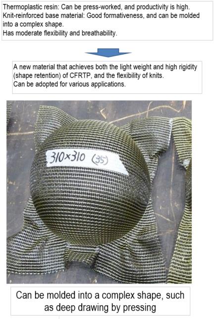 Since the product uses a knit fabric as the reinforcement base material and a thermoplastic resin as the matrix, it excels in pressworkability and can be worked into a complex shape such as deep drawing. While having lightweight/high-rigidity characteristicsof carbon fiber composites, it also has breathability and flexibility of mesh material. The company succeeded in impregnating aknit-reinforced base material with a thermoplastic resin, which was previously difficult to achieve, by using a special thermoplasticresin.