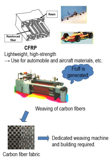 By covering carbon fibers, a general-purpose weaving machine can be used for weaving into fabric.