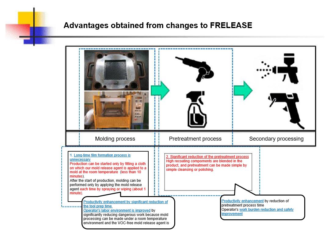 3) Cure processing of mold releasing films at tool prep process is not neccessary , and easy to start molding by applying release agent to the mold by spray or wiping.