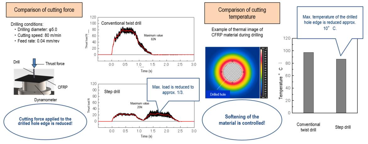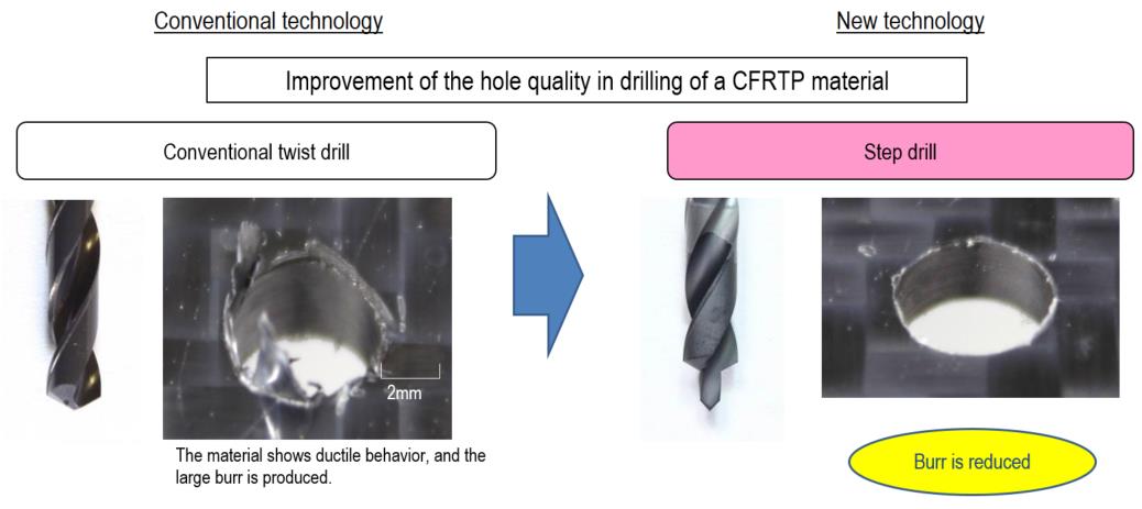 CFRTP materials shows ductile behavior in a drilling process in contrast with CFRP with thermosetting resin, and it causes a problem of large burr remaining at the drilled hole end using a conventional twist drill. In order to prevent large burr growing, we have proposed “a step drill” that distributes the cutting force for the work plate in drilling.