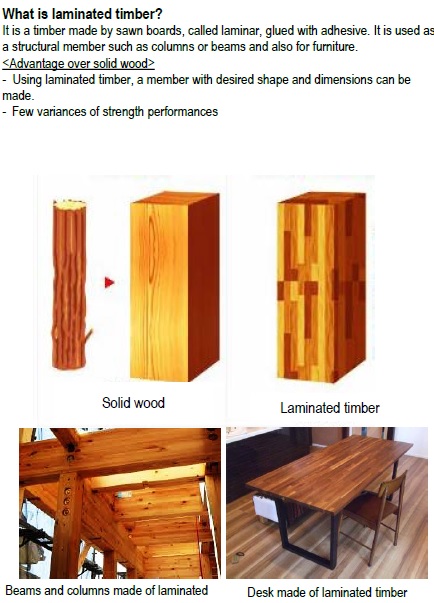 Unidirectional carbon fiber sheet using thermoplastic resin. By integrating this carbon fiber with laminated timber, a new laminated timber,which is thinner, lighter, and stronger than an ordinary laminated timber was developed. Domestically produced Japanese cedar timberespecially is low in strength, and its use as structural material is limited. By combining cedar timber with carbon fiber, the strength is increasedand it is expected that the usage amount of domestic timbers as structural materials is increased, resulting in a contribution to promotion of theforestry industry.