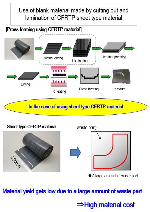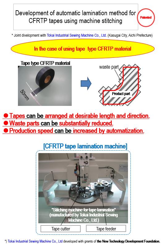 In terms of parts molding with carbon fiber reinforced thermoplastic (CFRTP) composite, we developed the automatic CFRTP tape lamination machine which can increase a material yield and reduce a lamination time substantially.