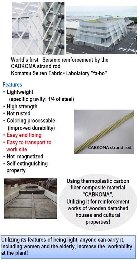 It is a carbon fiber rod that uses a thermoplastic resin. With this rod, end-part fixing, which was previously difficult, iseasily performed, and processing such as on-site bending is allowed. Utilizing its features of being light and strong,the product is expected to improve the workability of the conventional work and increase the productivity at theplant.