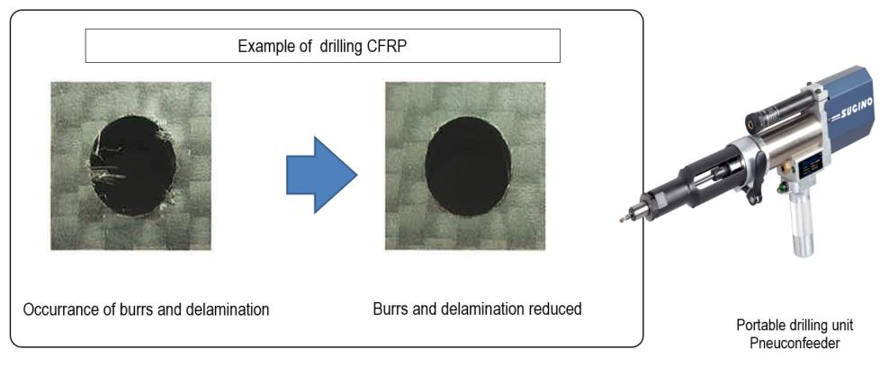 ・With conventional portable drilling unit, spindle precision was not enough. Therefore, when drilling CFRP, there were problems like burrs and delamination, and also shortening of tool life.
