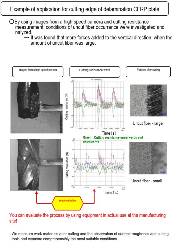 ・Analyze cutting dynamics of equipment in actual use by using a high speed camera and a tool dynamometer.