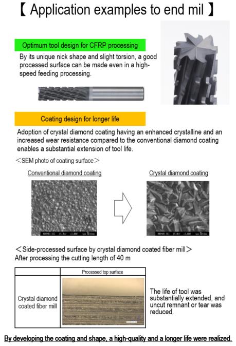 ・In the cutting process of carbon fiber reinforced resin (CFRP) by which the tool wears out very quickly, adoption of crystal diamond coating having an enhanced crystalline and an increased wear resistance greatly increases the life of tool.