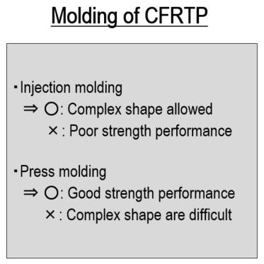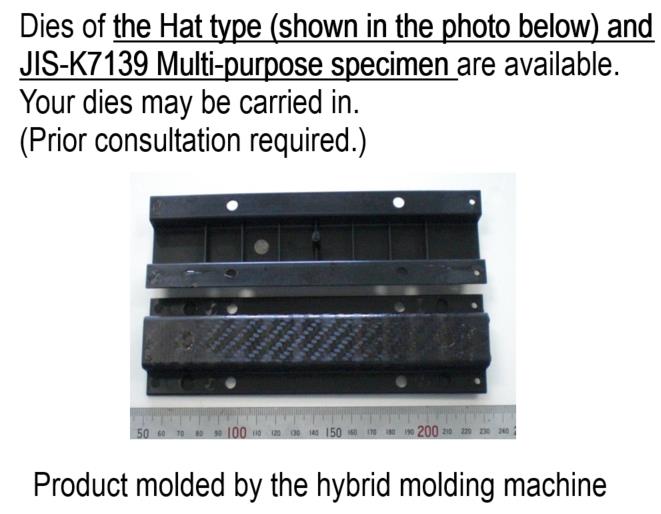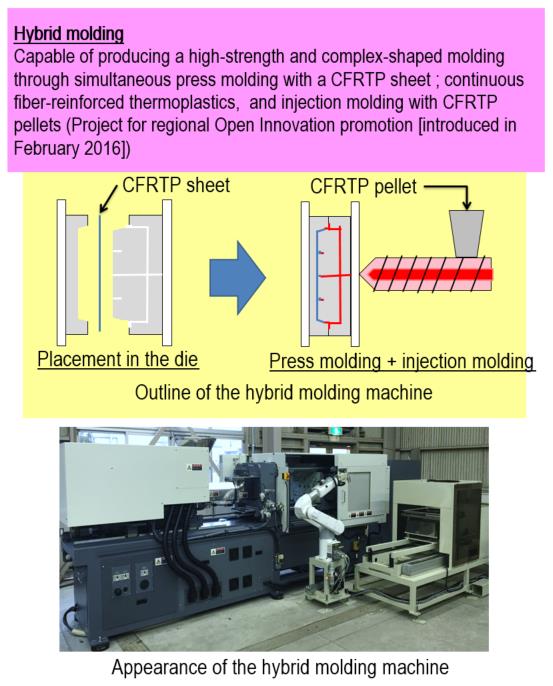 By the hybrid molding using sheets and pellets of carbon fiber reinforced thermoplastic resin (CFRTP) which enables manufacturing of parts having complex shape and high strength, we make efforts to support trial manufacturing and so on.