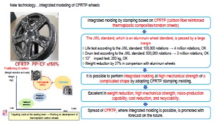 ☆It has realized integrated molding, at a shot, of a CFRTP (carbon fiber reinforced thermoplastic composite) carbon wheel by stamping molding.