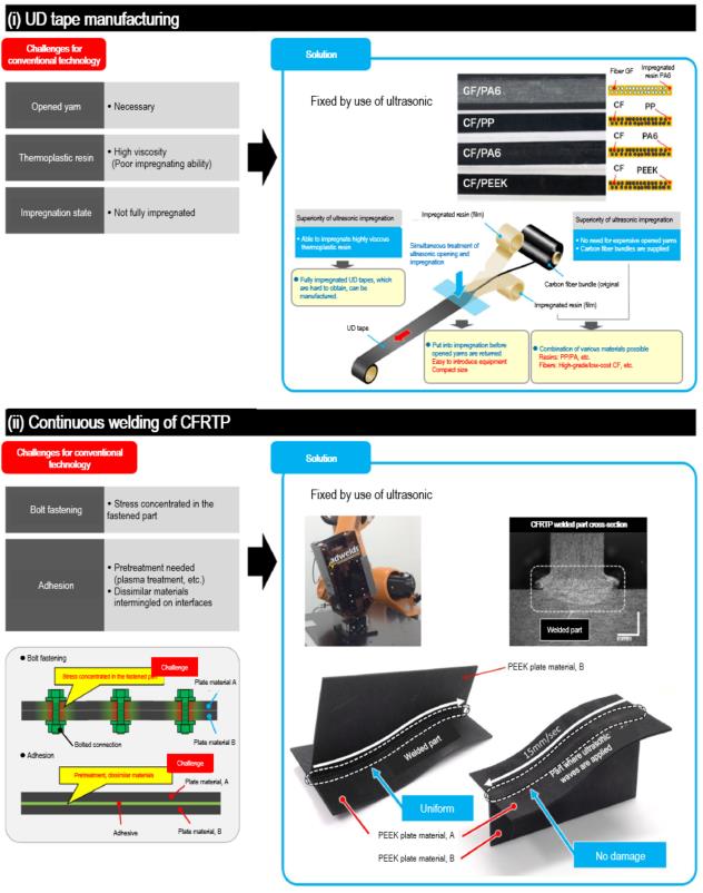 ●Continuous welding equipment for CFRTP parts:Continuous welding is obtained without damage on the surface where ultrasonic are applied, and thus high-intensity welding is realized. Welding of the PEEK material is also possible.