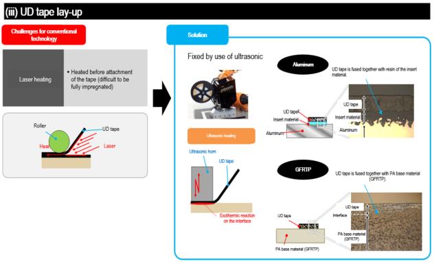 ●UD tape lay-up:Strong welding is realized where the resin on the lay-up interface is completely fused. Tape lay-up on aluminum is also possible.