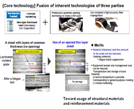 Thin-layer UD base material that is realized by fusion between Fukui Prefecture’s patented opening technology (withthe world best opening rate) and the fiber impregnation technology of our company.