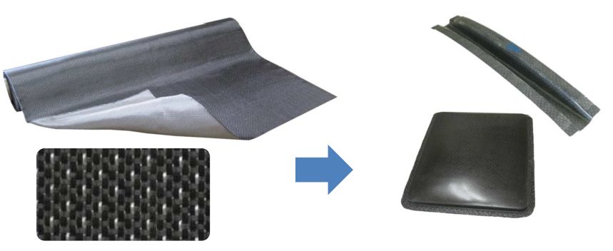 2. Strength of woven fabric is kept by designing woven structure with crimps of reinforcement yarn as possibly low level. And woven texture of reinforcement yarn, like carbon fiber, can clearly remain after molding.