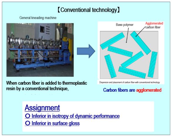 ・Injection molded parts which use commercially available CFRTP pellets are not able to exhibit sufficient mechanical performance because the carbon fibers are aggregated and oriented.