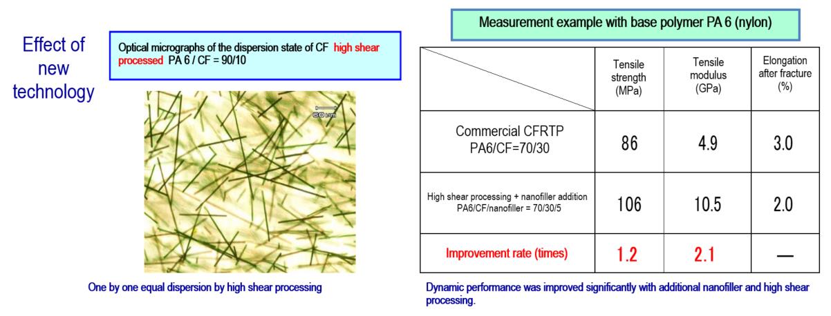 ・With the developed high shear processing method, agglomeration of carbon fibers were released, and uniform and isotropic dispersion became possible in the base polymer.