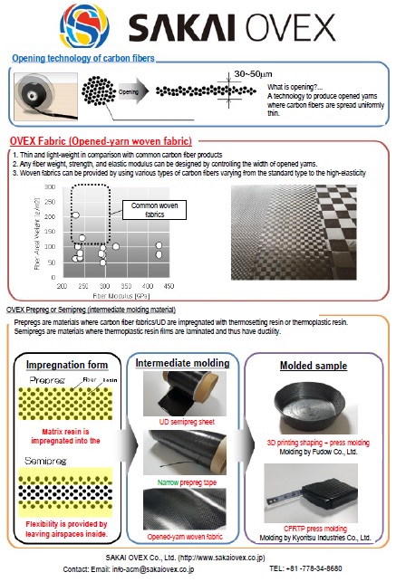・We propose "OVEX fabric," which is an intermediate molding material with “thickness and weight” reduced to 1/2 or less of the conventional material and "OVEX prepreg," which is an intermediate molding material made by impregnating UD with thermoplastic resin.