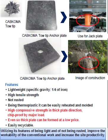 The thermoplastic resin to be used is a reactive thermoplastic epoxy resin. The original yarn (tow) of carbon fiber is directlyimpregnated with thermoplastic epoxy resin, and after being cured, it is cut into approx. 10 to 50 mm pieces (tips), and then theyare randomly oriented in a 3D manner to form a thick plate. Since this product is strong against compression, highly rigid,lightweight and resistant to rust, its use as a substitute for steel in fields such as civil engineering is expected.