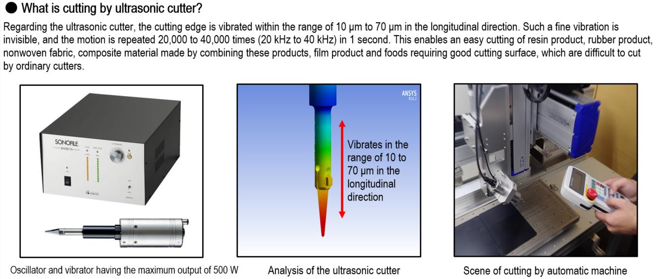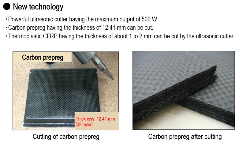 For cutting of CFRP, a large equipment such as laser and waterjet is used. We would like to propose an ultrasonic cutter as a relatively simple cutting tool. Use of the ultrasonic cutter enables an environmentally-friendly (few chippings produced), fast and easy cutting of unnecessary portions of a molded thermoplastic CFRP part.